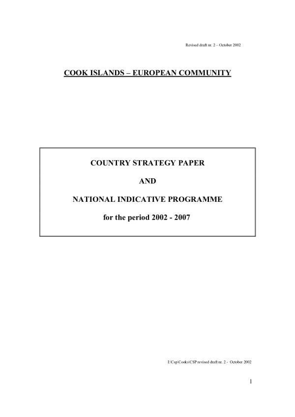 The purpose of the Country Strategy Paper (CSP) is to provide, on the basis of an analysis of the political, economic and social situation of the country, a response strategy for EC support under the 9th EDF. The Cook Islands is located at approximately 3,500 km north-east of New Zealand. The country consists of two groups of islands - 13 inhabited and two uninhabited - extending over 2 million km² of ocean. The North Cook Islands are atolls, the South Cook Islands are volcanic and comparatively fertile. The country has a land area of 237 km² and an Exclusive Economic Zone of 1,830,000 km². The GDP per capita in 1999 was 3,282.