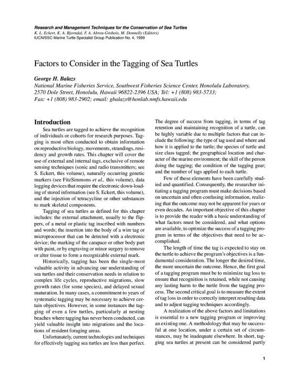 Sea turtles are tagged to achieve the recognition of individuals or cohorts for research purposes. Tagging is most often conducted to obtain information on reproductive biology, movements, strandings, residency and growth rates. This chapter will cover the use of external and internal tags, exclusive of remote sensing techniques (sonic and radio transmitters; see S. Eckert, this volume), naturally occurring genetic markers (see FitzSimmons et al., this volume), data logging devices that require the electronic down-loading of stored information (see S. Eckert, this volume), and the injection of tetracycline or other substances to mark skeletal components.