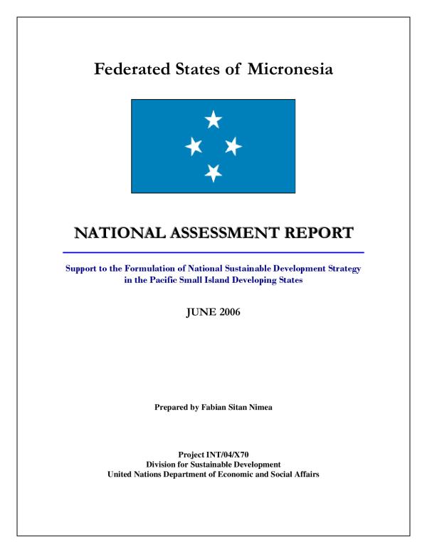 This report is prepared in response to the need to contribute to and facilitate implementation of national support to the formulation of National Sustainable Development Strategies (NSDS) in the Federated States of Micronesia (FSM). It is an initiative of the United Nations Department of Economic and Social Affairs (UNDESA) that serves as a prenatal to the NSDS. The policy implication of this approach is to determine if FSM is committed to put in place the institutional mechanisms needed to take a systematic and holistic approach to achieving sustainable development through integrated economic, social, and environmental policy planning. Much of the input material was synthesized from reports of previous conferences on the subject, literature on environmental management and sustainable development from international organizations, reports and books on FSM, and consultation with key actors from government as well as civil society representatives. The collected information has been analyzed and the resultant findings are presented in key areas of sustainable development strategy elaboration, such as priority and targets, strategies, indicators, and institutional framework.