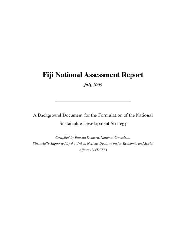 The aim of this report is to assess if the five key principles of the internationally agreed National Sustainable Development Strategy (NSDS) requirements (UNDESA 2005) are adequately incorporated into Fiji's national priorities and targets, strategies, indicators, and institutional framework. A national sustainable development strategy is a tool to integrate the national policies and plans from the various sectors with the aim of ensuring that economic development is socially responsible and maintains an adequate natural resource base for future generations.