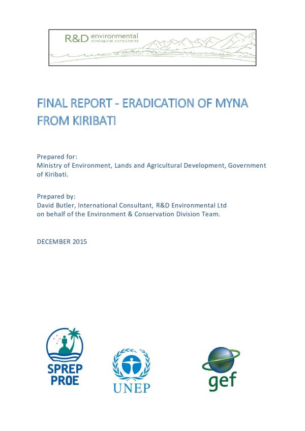 A programme to eradicate two species of myna from Kiribati was carried out between November 2014 and November 2015 by staff of the Environment & Conservation Division, Ministry of Environment, Lands and Agricultural Development with funds through the regional GEF-PAS Invasives project coordinated by UNEP and SPREP, assisted by international consultant Dave Butler. Record Created: 26-Jul-2016