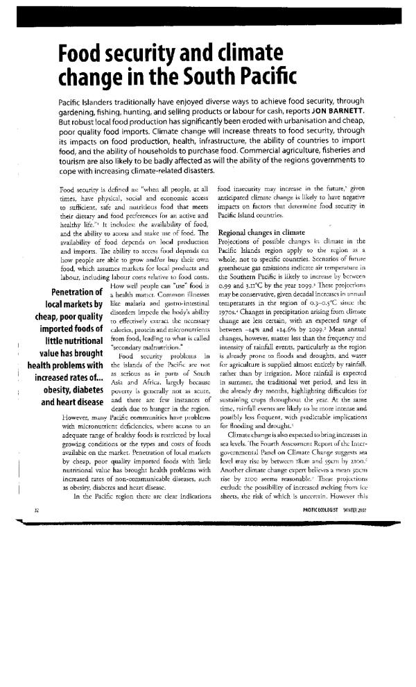 Pacific Islanders traditionally have enjoyed diverse ways to achieve food security, through gardening, fishing, hunting, and selling products or labour for cash, reports JON BARNETT. But robust local food production has significantly been eroded with urbanisation and cheap, poor quality food imports. Climate change will increase threats to food security, through its impacts on food production, health, infrastructure, the ability of countries to import food, and the ability of households to purchase food. Commercial agriculture, fisheries and tourism are also likely to be badly affected as will the ability of the regions governments to cope with increasing climate-related disasters.
