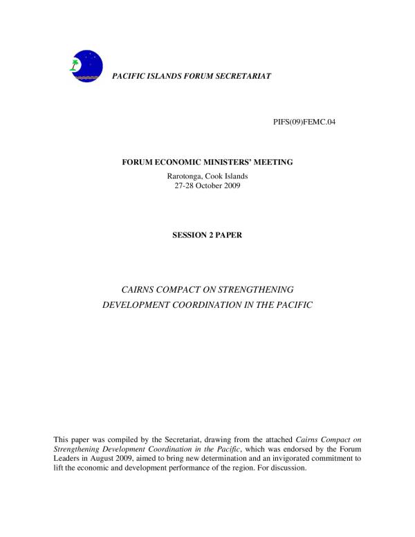The purpose of this paper is to provide an overview of the Cairns Compact on Strengthening Development Coordination (the Compact); its objectives, guiding principles, key deliverables and intended benefits to Forum Island Countries and Development Partners. It also provides an outline of work to date undertaken by the Pacific Islands Forum Secretariat in coordinating and progressing the implementation of the Compact.
