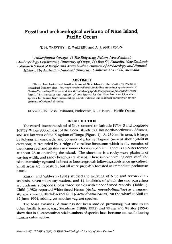 The archaeological and fossil avifauna of Niue Island in the southwest Pacific is described from ten sites. Fourteen species of birds, including an extinct species each of Gallirallus and Nydicorm, and an extirpated megapode (Megapodiuspritchardii) were found. This increases the number of taxa known for the Niue fauna to 15 resident species, but faunas from surrounding islands indicate this is almost certainly an underestimate of original diversity