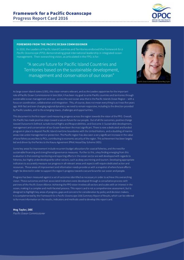 This first report card measuring progress across the region towards the vision of the FPO. Overall the Pacific, has made a positive steps towarda secure future for our people.