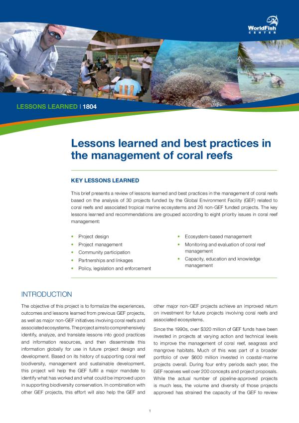The objective of this project is to formalize the experiences, outcomes and lessons learned from previous GEF projects, as well as major non-GEF initiatives involving coral reefs and associated ecosystems. The project aims to comprehensively identify, analyze, and translate lessons into good practices and information resources, and then disseminate this information globally for use in future project design and development. Based on its history of supporting coral reef biodiversity, management and sustainable development, this project will help the GEF fulfill a major mandate to identify what has worked and what could be improved upon in supporting biodiversity conservation. In combination with other GEF projects, this effort will also help the GEF and other major non-GEF projects achieve an improved return on investment for future projects involving coral reefs and associated ecosystems.