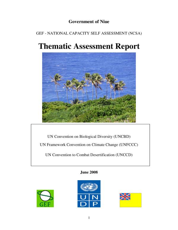 Niue as a Party to the Rio Conventions, namely the Convention on Biological Diversity, the Convention on Combating Desertification, and the Framework Convention on Climate Change, is preparing its National Capacity Self Assessment Report to identify the capacity gaps on the implementation of the Conventions. The thematic assessment component of the National Capacity Self Assessment (NCSA) Project reviews the status of implementation for each of the three Rio Conventions at the national level. It further analysis the capacity constraints on the implementation and proposes potential opportunities for building the three levels of capacity development at the country level.