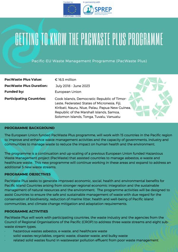 The European Union funded PacWaste Plus programme, will work with 15 countries in the Pacific region to improve and enhance waste management activities and the capacity of governments, industry and communities to manage waste to reduce the impact on human health and the environment.