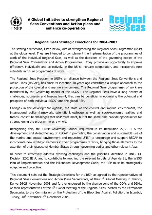 The strategic directions, listed below, aim at strengthening the Regional Seas Programme (RSP) at the global level. They are intended to complement the implementation of the programmes of work of the individual Regional Seas, as well as the decisions of the governing bodies of the Regional Seas Conventions and Action Programmes. They provide an opportunity to improve efficiency, individually and collectively, in the RSPs, increase cooperation, and incorporate new elements in future programmes of work.