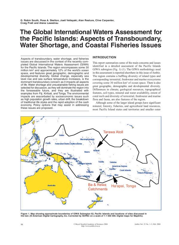This report summarizes some of the main concerns and issues identified in a detailed assessment of the Pacific Islands GIWA subregion. The GIWA methodology used in this assessment is reported elsewhere in this issue of Ambio. The region contains a baffling diversity of island types and corresponding terrestrial, freshwater and marine ecosystems covering some 30 million km2 of ocean space. There is also great geographic, demographic and developmental diversity. Differences in climate, geological resources, topographical features, soil types, mineral and water availability, extent of coral reefs and diversity of terrestrial, freshwater and marine flora and fauna, are also features of the region.
