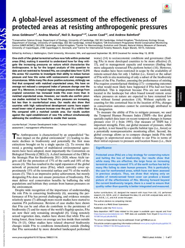 One-sixth of the global terrestrial surface now falls within protected areas (PAs), making it essential to understand how far they miti-gate the increasing pressures on nature which characterize the Anthropocene.