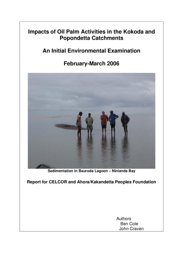 An initial environmental examination (IEE) of the impacts of oil palm activities in the Popondetta area has been undertaken. Through agreement with the Australian Conservation Foundation (ACF) and The Centre for Environmental Law and Community Rights Inc. (CELCOR), environmental consultants Ben Cole and John Craven were engaged to undertake the IEE. The aims of the IEE were to identify issues and to determine priorities for an environmental impact assessment (EIA) and evaluate whether available data could support legal action.