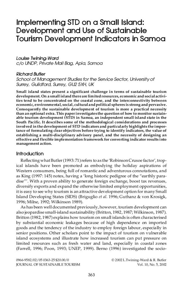 Small island states present a significant challenge in terms of sustainable tourism development. On a small island there are limited resources, economic and social activities tend to be concentrated on the coastal zone, and the interconnectivity between economic, environmental, social, cultural and political spheres is strong and pervasive. Consequently the sustainable development of tourism is more a practical necessity than an optional extra. This paper investigates the question of how to monitor sustainable tourism development (STD) in Samoa, an independent small island state in the South Pacific. It describes some of the methodological considerations and processes involved in the development of STD indicators and particularly highlights the importance of formulating clear objectives before trying to identify indicators, the value of establishing a multi-disciplinary advisory panel, and the necessity of designing an effective and flexible implementation framework for converting indicator results into management action.