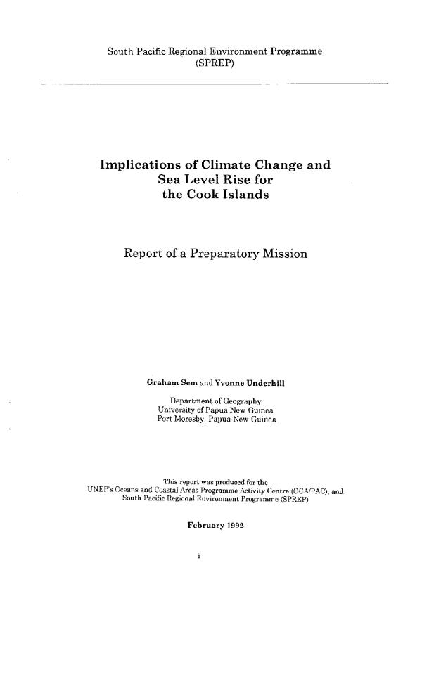 This report details the findings of a two-person climate change task team mission to the Cook Islands during the period January 14-22 1992. The report outlines the possible impacts of climate change and consequent sea-level rise on the natural, physical, social and economic activities perceived by the authorities and organisations in the country. Possible response options were difficult to identify because local scientific information about impacts was not avaiable.