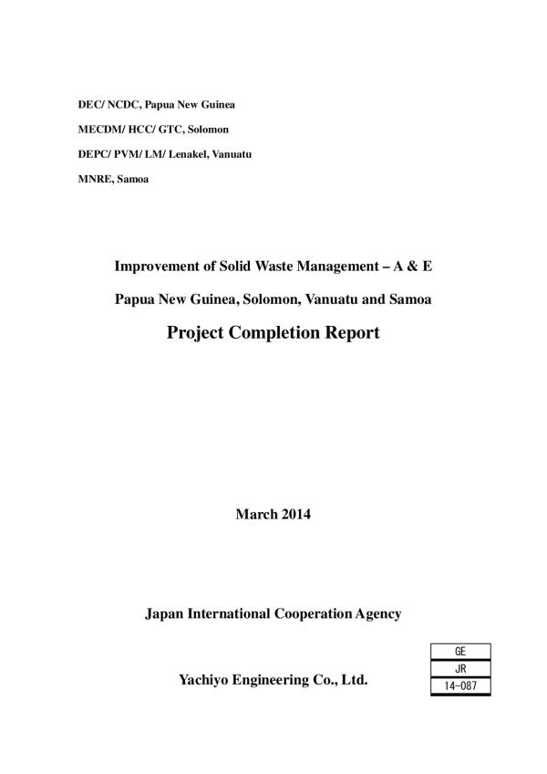 The Secretariat of the Pacific Regional Environment Programme (SPREP) and JICA prepared the Pacific Regional Solid Waste Management Strategy (2010-2015) (hereafter referred to as RS2010) where a number of priority areas where identified for the SWM sector. The J-PRISM regional outputs were developed considering some of these priorities. The activities of the J -PRISM project are implemented through assignment of counterparts by each of the 11 PICs covered in the Project to work with experts dispatched by JICA. The JICA Chief Advisor for this project is stationed in Samoa and is supported by a regional expert serving as Assistant Chief Advisor and two JICA project coordinators dispatched from Japan. During the period from project commencement in 2011 to 2013, JICA dispatched 6 short term experts to the region, working under the Chief Advisor and having responsibilities for specified countries of the 11 PICs covered under the project. Short term experts A and E were assigned responsibilities for PNG, Solomon and Vanuatu. Samoa was covered directly by the Project Office.The Experts dispatched under this JICA Expert Team (JET) were responsible for the Project activities in the four PIC countries of PNG, Solomon, Vanuatu and Samoa. In addition to the regional outputs, each of the 11 individual countries developed their own outputs. These are shown in Figure 3, together with the cities targeted in each country for the project and the populations and estimated waste generation amounts for each of these cities. Details of the PDMs for each of the four countries are provided in the attachments of this report.