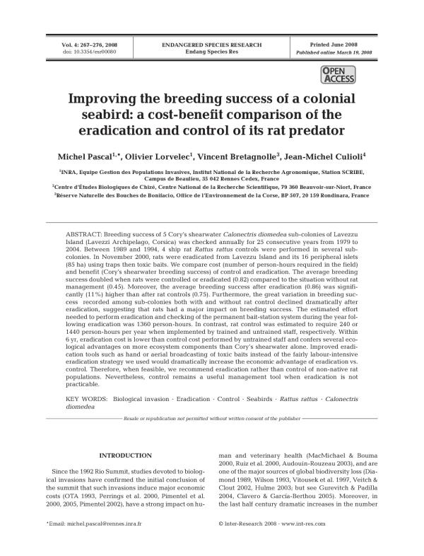 Breeding success of 5 Corys shearwater Calonectris diomedea sub-colonies of Lavezzu Island (Lavezzi Archipelago, Corsica) was checked annually for 25 consecutive years from 1979 to 2004. Between 1989 and 1994, 4 ship rat Rattus rattus controls were performed in several subcolonies. In November 2000, rats were eradicated from Lavezzu Island and its 16 peripheral islets (85 ha) using traps then toxic baits. We compare cost (number of person-hours required in the field) and benefit (Corys shearwater breeding success) of control and eradication. The average breeding success doubled when rats were controlled or eradicated (0.82) compared to the situation without rat management (0.45). Moreover, the average breeding success after eradication (0.86) was significantly (11%) higher than after rat controls (0.75). Furthermore, the great variation in breeding success recorded among sub-colonies both with and without rat control declined dramatically after eradication, suggesting that rats had a major impact on breeding success. The estimated effort needed to perform eradication and checking of the permanent bait-station system during the year following eradication was 1360 person-hours. In contrast, rat control was estimated to require 240 or 1440 person-hours per year when implemented by trained and untrained staff, respectively. Within 6 yr, eradication cost is lower than control cost performed by untrained staff and confers several ecological advantages on more ecosystem components than Corys shearwater alone. Improved eradication tools such as hand or aerial broadcasting of toxic baits instead of the fairly labour-intensive eradication strategy we used would dramatically increase the economic advantage of eradication vs. control. Therefore, when feasible, we recommend eradication rather than control of non-native rat populations. Nevertheless, control remains a useful management tool when eradication is not practicable. Record Created: 22-Aug-2018