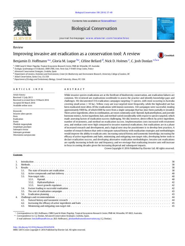 While invasive species eradications are at the forefront of biodiversity conservation, ant eradication failures are common. We reviewed ant eradications worldwide to assess the practice and identify knowledge gaps and challenges. We documented 316 eradication campaigns targeting 11 species, with most occurring in Australia covering small areas (b10 ha). Yellow crazy ant was targeted most frequently, while the bigheaded ant has been eradicated most often. Of the eradications with known outcomes, 144 campaigns were successful, totaling approximately 9500 ha, of which 8300 ha were from a single campaign that has since been partially re-invaded. Three active ingredients, often in combination, are most commonly used: fipronil, hydramethylnon, and juvenile hormone mimics. Active ingredient, bait, and method varied considerablywith respect to species targeted,which made assessing factors of eradication success challenging. We did, however, detect effects by active ingredient, number of treatments, and method on eradication success. Implementation costs increased with treatment area, and median costs were high compared to invasive mammal eradications. Ant eradications are in a phase of increased research and development, and a logical next step for practitioners is to develop best practices. A number of research themes that seek to integrate natural history with eradication strategies and methodologies would improve the ability to eradicate ants: increasing natural history and taxonomic knowledge, increasing the efficacy of active ingredients and baits, minimizing and mitigating non-target risks, developing better tools to declare eradication success, and developing alternative eradication methodologies. Invasive ant eradications are rapidly increasing in both size and frequency, and we envisage that eradicating invasive ants will increase in focus in coming decades given the increasing dispersal and subsequent impacts. Record Created: 24-Apr-2018