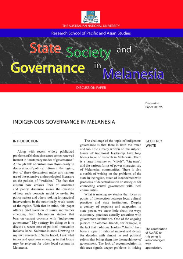 Along with recent widely publicized problems of Melanesian states comes renewed interest in “customary modes of governance.” Although talk of custom now flows easily in discussions of political reform in the region, few of these discussions make any serious use of the extensive anthropological literature on the politics of “tradition.” The fact that custom now crosses lines of academic and policy discourse raises the question of how such concepts might be useful for policymakers and others looking for practical interventions in the notoriously weak states of the region. With that in mind, this paper offers a brief overview of issues and themes emerging from Melanesian studies that bear on current concerns with “indigenous governance.” My strategy for doing so is to discuss a recent case of political innovation in Santa Isabel, Solomon Islands. Drawing on my own research in Santa Isabel, I ask what issues and questions emerging in that locale may be relevant for other local systems in Melanesia.
