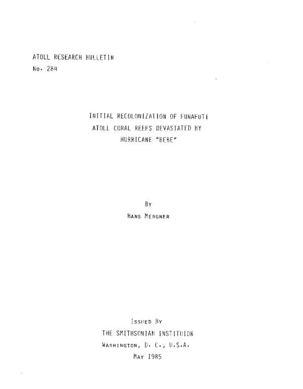 On the 21st of October, 1972, hurricane "Bebe" devas- tated a large part of Funafuti atoll, Ellice Islands. Among the most spectacular geomorphological alterations caused by the hurricane was a storm beach 19 km long, 4 m high and 37 m wide. The amount of coral debris washed up from the offshore coral reefs onto the reef flat was estimated at 2.8 x 10 tons of material (Baines, Beveridge and Maragos, 1974). The oceanside reef communities of the SE and E rim of the atoll had been totally destroyed, and those of the inner reefs of the lagoon side had been heavily damaged. Eight months after the storm a quantitative analysis of the resettlement and recruitment of coral species on 7 reef sections was carried out: the destruction of the biophysiographic zones could be described as increasing from the northern border and also to the W rim of the atoll. Near the centre at Fongafale the lagoon reef flat was covered by thick carpets of the brown alga Dictyota bartaysii, possibly brought about by eutrophication effects. The resettlement of the reef flat by corals began with the recolonization of branching corals as well as regeneration of the very few surviving massive corals: about 80% of the number of new colonies belong to Acropora (mainly A. humilis and A. hyaclnthus), and about 20% to Pocillopora eydouxi, Porltes lutea (?) and some Faviidae. The percentage of the area settled by the massive coral species is, however, greater than that settled by the branching species. Nevertheless, in the long-term, branching corals are expected to have a decisive influence on the future structural and biophysiographic zonation of the reef edge and reef flat, due to their more numerous young colonies, which are evenly scattered over the reef area, and due to their rapid growth rate. Consequently, an Acropora humilis - hyacinthus-community or an Acropora - Pocillopora eydouxi-assemblage can be predicted as the future biophysiographic zone.
