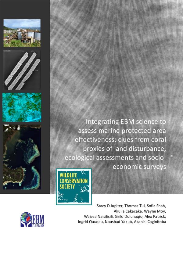 Research for this study was carried out under a two-year project to support the implementation of Ecosystem-Based Management (EBM) at two catchment-to-reef sites on Vanua Levu, Fiji, during which period a pilot study was initiated to evaluate whether longlived coral records could be used to detect land-based disturbance to Fijian reefs. Trace element ratios of barium (Ba) to calcium (Ca) were measured at high (~weekly) resolution with laser ablation inductively coupled mass spectrometry (LA-ICP-MS) in cores collected from inshore and offshore Porites colonies. The Ba/Ca records from the inshore colony collected approximately 5 km south-east of the Yanawai River mouth and 3 km due west of the Nasue marine protected area (MPA) indicate heavy Ba/Ca enrichment between 1996- 1998, which may be related to high levels of sediment delivery to the nearshore while the Mt. Kasi gold mine was operational. Ba/Ca values from the offshore coral collected near the Namena MPA show consistently low baseline values during the same period and over the entire record. Underwater visual census (UVC) surveys of fish biomass, abundance and species richness from 2007 show significantly lower values inside the Nasue MPA than at adjacent sites open to fishing, while the opposite patterns are generally true for the Namena MPA. By synthesizing interdisciplinary data from multiple sources, deductive logic can be used to decipher major drivers of differences in effectiveness of the two district MPAs. Benthic survey data from Nasue closed and open areas showed no significant differences in specific factors which may indicate recent disturbance (e.g. macroalgal cover, rubble) and/or play strong roles in structuring reef fish communities (e.g. live coral cover, presence of fast growing branching corals, reef complexity). Therefore, we conclude that the historical disturbance from the Yanawai River either had minimal effect on benthic communities in Nasue MPA in sites surveyed or they have subsequently recovered and should therefore be able to support healthy reef fish populations if not subject to other types of disturbance. Socioeconomic surveys indicate that Kubulau residents are occasionally witness to infringements of MPA rules and the majority offenders come from outside the district. However, at the same time, Kubulau residents themselves have indicated catch locations within the Nasue (but not Namena) district MPA, suggesting that accidental or deliberate poaching occurs regularly, likely due to lack of awareness of MPA rules and boundaries and inability to see the Nasue MPA from the shore. Recommendations to improve the effectiveness of the MPA are discussed.