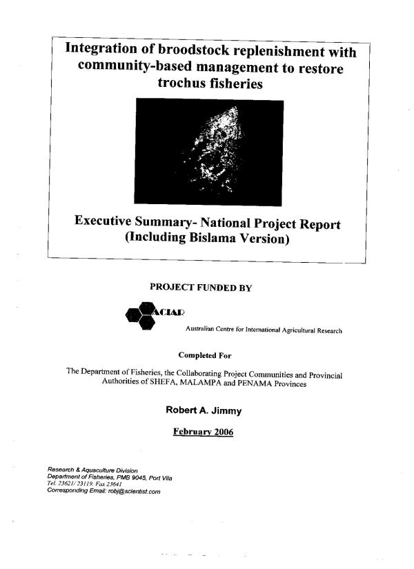 Vanuatu's involvement in trochus research commenced in the early 1990s and its in involvement in the Australian Centre for International Agriculture Research (ACIAR) trochus funded project spanned over 10 years. This encompassed 3 phases of the ACIAR trochus funded research project, with phase 1 of the project involving nutritional aspect of trochus, phase 2 concentrated on hatchery seed production and reef reseeding and the final phase concentrated on broodstock enhancement using a community-based management approach.
