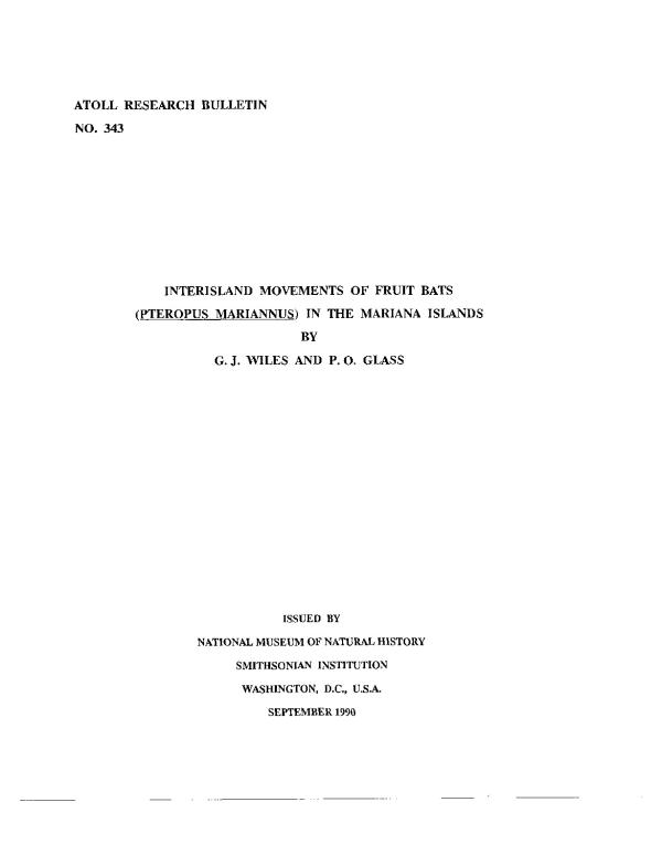 Fruit bats of the genus Pteropus are considered to be strong fliers (Kingdon, 1974; Nowak and Paradiso, 1983), with some species commuting distances of 10-50 km between day roosts and feeding areas (Breadon, 1932; Ferrar, 1934; Hall, 1983; Lim, 1966; McWilliam, 1985-1986; Ratcliffe, 1932; Taylor, 1934; Walton and Trowbridge, 1983). Longer seasonal movements of > 100 km are known for several species of Australian Pteropus, which change roosting sites in response to shifting patterns in the availability of flowers and fruits (Nelson, 1965). However, for most members of the genus, movements remain poorly understood. This is especially true for populations of Pteropus in the Pacific Ocean, many of which are restricted to small islands or small island groups.