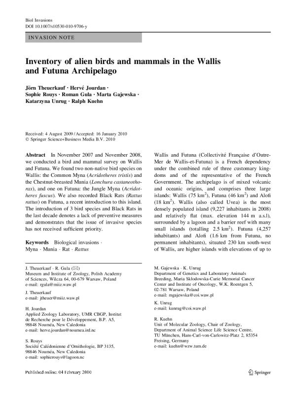 In November 2007 and November 2008, we conducted a bird and mammal survey on Wallis and Futuna. We found two non-native bird species on Wallis: the Common Myna (Acridotheres tristis) and the Chestnut-breasted Munia (Lonchura castaneothorax), and one on Futuna: the Jungle Myna (Acridotheres fuscus). We also recorded Black Rats (Rattus rattus) on Futuna, a recent introduction to this island. The introduction of 3 bird species and Black Rats in the last decade denotes a lack of preventive measures and demonstrates that the issue of invasive species has not received sufficient priority