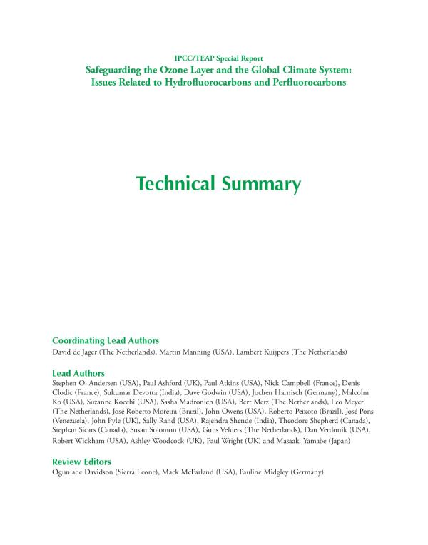 This IPCC Special Report was developed in response to invitations by the United Nations Framework Convention on Climate Change (UNFCCC)1 and the Montreal Protocol on Substances that Deplete the Ozone Layer2 to prepare a balanced scientific, technical and policy relevant report regarding alternatives to ozone-depleting substances (ODSs) that affect the global climate system. It has been prepared by the IPCC and the Technology and Economic Assessment Panel (TEAP) of the Montreal Protocol.