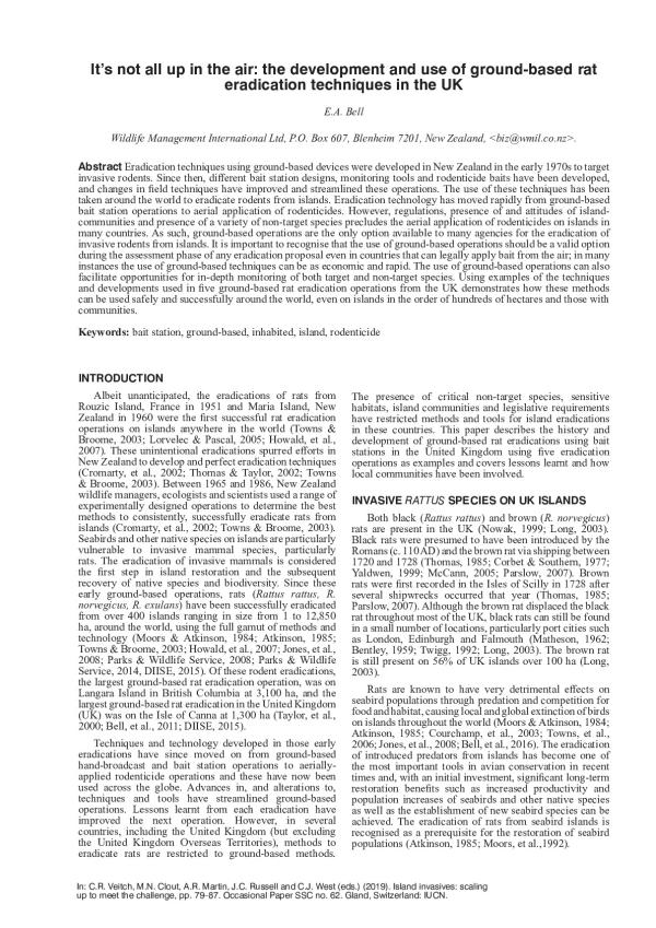 Eradication techniques using ground-based devices were developed in New Zealand in the early 1970s to target invasive rodents. Since then, different bait station designs, monitoring tools and rodenticide baits have been developed, and changes in field techniques have improved and streamlined these operations. The use of these techniques has been taken around the world to eradicate rodents from islands. Eradication technology has moved rapidly from ground-based bait station operations to aerial application of rodenticides. However, regulations, presence of and attitudes of island-communities and presence of a variety of non-target species precludes the aerial application of rodenticides on islands in many countries. As such, ground-based operations are the only option available to many agencies for the eradication of invasive rodents from islands. It is important to recognise that the use of ground-based operations should be a valid option during the assessment phase of any eradication proposal even in countries that can legally apply bait from the air; in many instances the use of ground-based techniques can be as economic and rapid. The use of ground-based operations can also facilitate opportunities for in-depth monitoring of both target and non-target species. Using examples of the techniques and developments used in five ground-based rat eradication operations from the UK demonstrates how these methods can be used safely and successfully around the world, even on islands in the order of hundreds of hectares and those with communities.