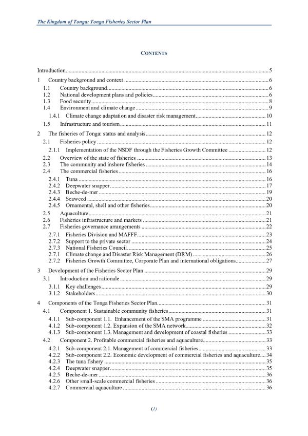 The purpose of the Tonga Fisheries Sector Plan for the Kingdom of Tonga is to: a) identify priority areas for investment that will maximise the sustainable contribution of the fisheries sector to food security and economic growth b) present and cost specific programs/activities to achieve these priorities c) identify possible sources of financing for the specific programs/activities d) provide a framework for implementation and to monitor progress in the short- to medium-term.