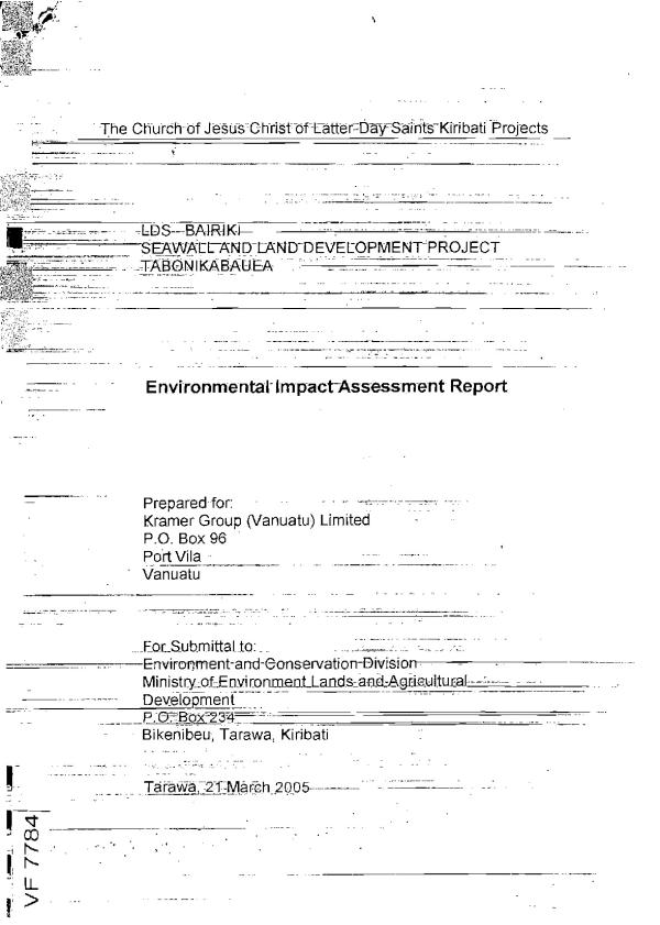 This environmental impact assessment reports on the proposed seawall construction and land development project of the Church of Jesus Christ of Latter Day Saints, which is to be located at Tabonikabauea in Bairiki, and will be implemented by Kramer Group (Vanuatu) Limited, and local contractors.
