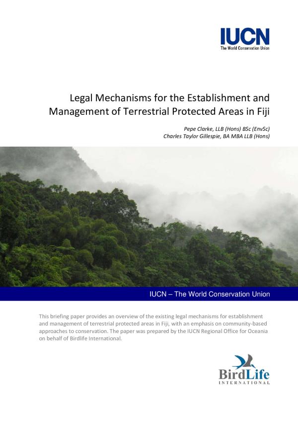 Available online|This briefing paper provides an overview of the existing legal mechanisms for establishment and management of terrestrial protected areas in Fiji, with an emphasis on community-based approaches to conservation. The paper was prepared by the IUCN Regional Office for Oceania on behalf of Birdlife International