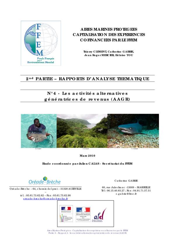 The prohibition of certain activities to certain areas or certain methods of operation resulting environmental degradation and / or pressure on resources may lead to a revenue loss for people. This loss may materialize in the short term only to eventually subside long term1 . To compensate for these losses and divert populations unsustainable exploitation activities resources , projects often propose to develop alternative development, or alternative activities income generation ( AAGR ) .