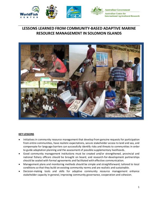 This brief presents a review of lessons learned and good practices in developing management plans within the context of community based resource management (CBRM) in Solomon Islands. The lessons are based on work done by the WorldFish Center, the Foundation of the Peoples of the South Pacific International (FSPI) and the Solomon Islands Ministry of Fisheries and Marine Resources. The document is intended to complement other initiatives in the country and through the Solomon Islands Locally Managed Marine Area Network add to lessons learned by other organizations in order to help the people and the government of the Solomon Islands meet their marine resource management goals.