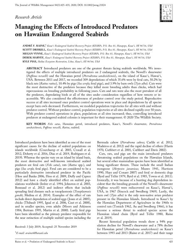 Introduced predators are one of the greatest threats facing seabirds worldwide. We investigated the effects of multiple introduced predators on 2 endangered seabirds, the Newell's shearwater and the Hawaiian petrel on the island of Kaua'i, Hawaii, USA.