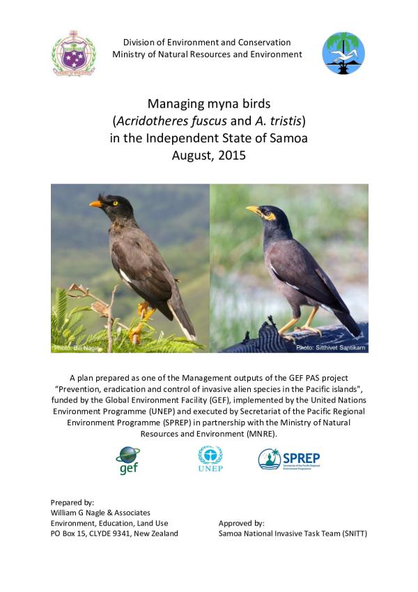 This document builds on lessons learned from 10 years of DEC-MNRE action on the myna issue, training workshops on invasive species management, a 2015 myna population transect survey (conservative estimate of total population in Samoa between 129,407 and 188,583 birds), appropriate literature and experiences in Pacific and other countries. Recommendations are made on strategies and the priority information needed to implement those strategies. Reducing the threat to the people and biodiversity of Malo Sa'oloto Tuto'atasi o Sámoa from an ever-increasing population of myna (also mynah) birds (Maina fanua) - Jungle myna (Acridotheres fuscus) and Maina vao - Common (also Indian) myna (Acridotheres tristis) will require implementation of all three strategies of invasive species management; prevention, eradication, control.
