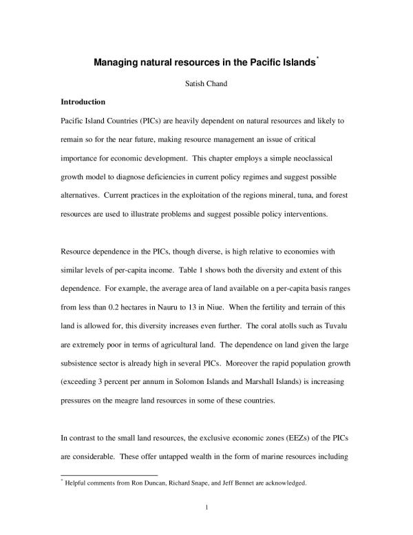 Pacific Island Countries (PICs) are heavily dependent on natural resources and likely to remain so for the near future, making resource management an issue of critical importance for economic development. This chapter employs a simple neoclassical growth model to diagnose deficiencies in current policy regimes and suggest possible alternatives. Current practices in the exploitation of the regions mineral, tuna, and forest resources are used to illustrate problems and suggest possible policy interventions.