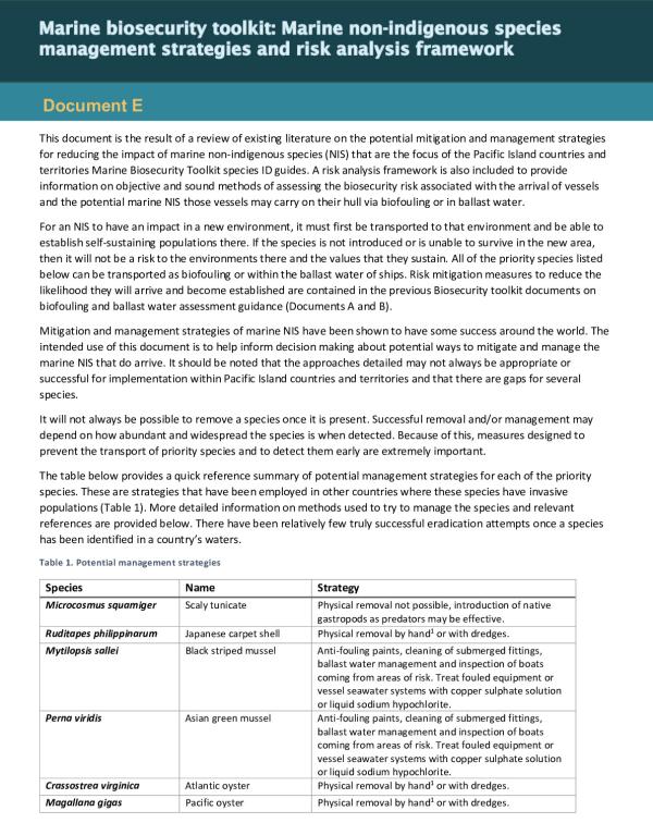 This document is the result of a review of existing literature on the potential mitigation and management strategies for reducing the impact of marine non-indigenous species (NIS) that are the focus of the Pacific Island countries and territories Marine Biosecurity Toolkit species ID guides. A risk analysis framework is also included to provide information on objective and sound methods of assessing the biosecurity risk associated with the arrival of vessels and the potential marine NIS those vessels may carry on their hull via biofouling or in ballast water.