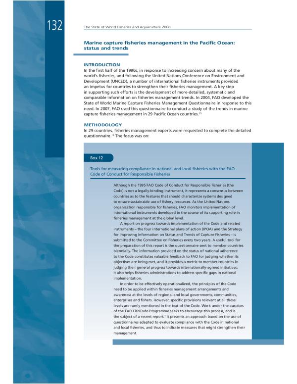 In the first half of the 1990s, in response to increasing concern about many of the world's fisheries, and following the United Nations Conference on Environment and Development (UNCED), a number of international fisheries instruments provided an impetus for countries to strengthen their fisheries management. A key step in supporting such efforts is the development of more-detailed, systematic and comparable information on fisheries management trends. In 2004, FAO developed the State of World Marine Capture Fisheries Management Questionnaire in response to this need, in 2007, FAO used this questionnaire to conduct a study of the trends in marine capture fisheries management in 29 Pacific Ocean countries.