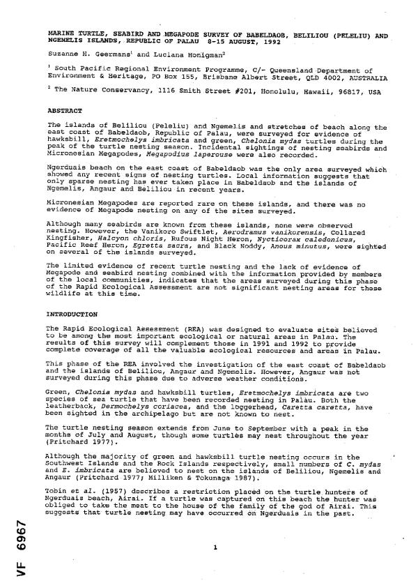 The islands of Beliliou (Peleliu) and Ngemelis and stretches of beach along the east coast of Babeldaob, Republic of Palau, were surveyed for evidence of hawksbill, Eretmochelys Imbricata and green, Chelonia mydas turtles during the peak of the turtle nesting season. Incidental sightings of nesting seabirds and Micronesian Megapodes, Negapodius laperouse were also recorded. Ngerduais beach on the east coast of Babeldaob was the only area surveyed which showed any recent signs of nesting turtles. Local information suggests that only sparse nesting has ever taken place in Babeldaob and the islands of Ngemelis, Angaur and Beliliou in recent years. Micronesian Megapodes are reported rare on these islands, and there was no evidence of Megapode nesting on any of the sites surveyed. Although many seabirds are known from these islands, none were observed nesting. However, the Vanikoro Swiftlet, Aerodramus vanikorensis, Collared Kingfisher, Halcyon chlorls, Rufous Night Heron, Nycticorax caledonicus, Pacific Reef Heron, Egretta sacra, and Black Noddy, Anous minutus, were sighted on several of the islands surveyed. The limited evidence of recent turtle nesting and the lack of evidence of Megapode and seabird nesting combined with the information provided by members of the local communities, indicates that the areas surveyed during this phase of the Rapid Ecological Assessment are not significant nesting areas for these wildlife at this time.