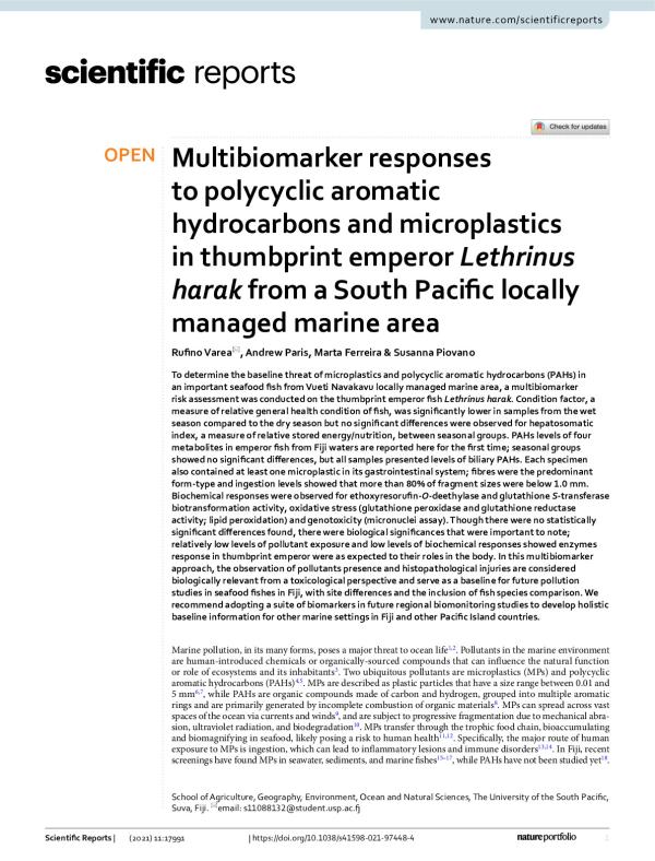 To determine the baseline threat of microplastics and polycyclic aromatic hydrocarbons (PAHs) in an important seafood fish from Vueti Navakavu locally managed marine area, a multibiomarker risk assessment was conducted on the thumbprint emperor fish.