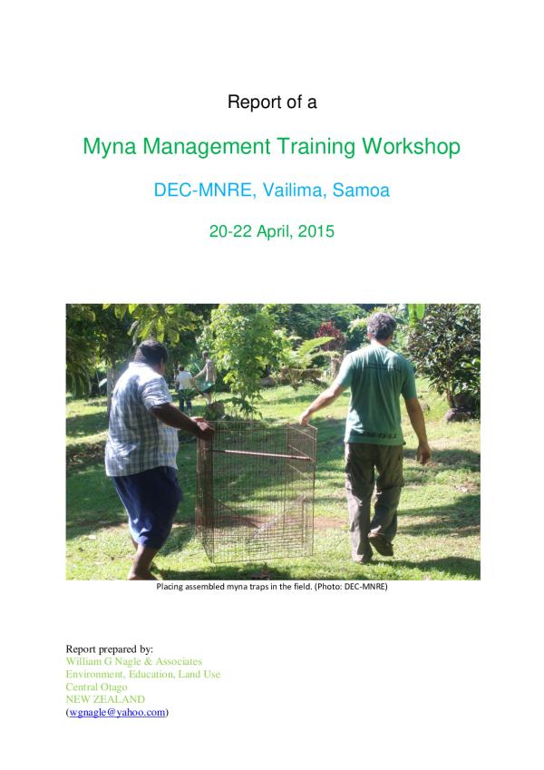 The Division of Environment and Conservation of the Ministry of Natural Resources and Environment of the Government of Samoa (DEC-MNRE) is implementing a project as part of the Global Environment Facility - Pacific Alliance for Sustainability (GEF-PAS) Invasive Alien Species project funded by the United Nations Environment Program and executed by SPREP. The project identifies the need to determine realistic management goals and best management practices for myna species in Samoa and use them to write a management plan.