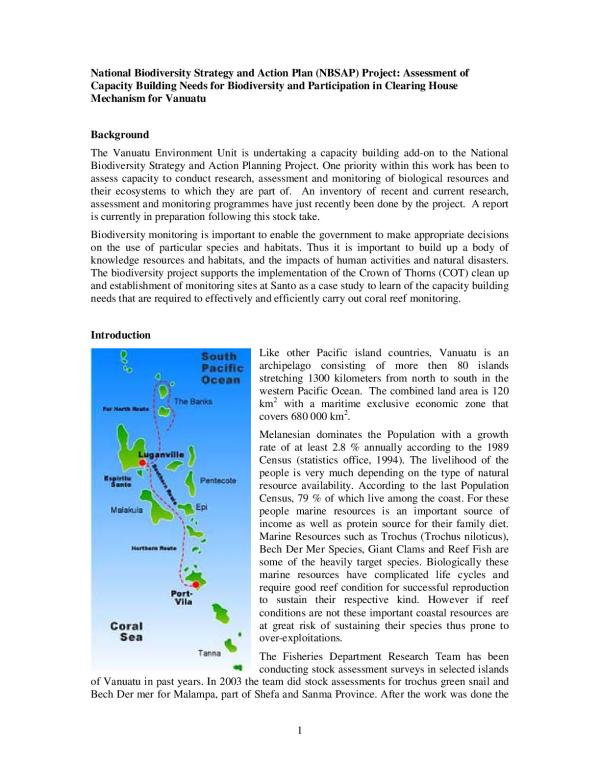 The Vanuatu Environment Unit is undertaking a capacity building add-on to the National Biodiversity Strategy and Action Planning Project. One priority within this work has been to assess capacity to conduct research, assessment and monitoring of biological resources and their ecosystems to which they are part of. An inventory of recent and current research, assessment and monitoring programmes have just recently been done by the project. A report is currently in preparation following this stock take.