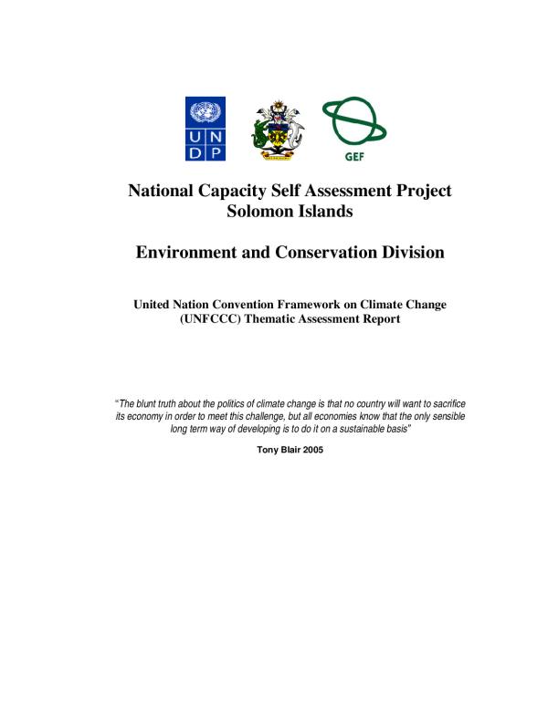 The National Capacity Self Assessment Project funded by the Global Environment Facility (GEF) through UNDP is assisting stakeholders in Solomon Islands self asses their capacity to address global and environment issues and develop a plan of action to address priority capacity building needs. The project focuses on three international Conventions, the UN Convention on Biological Diversity (UNCBD) UN Framework Convention on Climate Change (UNFCCC) and UN Convention to Combat Desertification (UNCCD). This thematic report focuses on the UNFCCC and is a follow up from an earlier stocktake report. The thematic assessment process is intended to identify climate change issues and a range of related convention requirements that are not adequately addressed, their underlying causes, the contributing factors, and the key barriers. The analysis leads to an assessment of the nature of the capacity needs and opportunities for capacity development. This report presents the outcomes of a comprehensive analysis of the stock take report and recommendations from a national consultation workshop in July 2006 that considered the Stock-take report, and establishes the root causes of the capacity gaps identified.