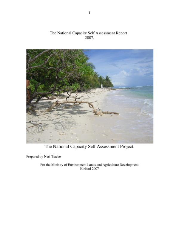 Progress in Measures taken to Combat Land Degradation and to Implement the Convention 1 The National Capacity Self Assessment Report 2007. The National Capacity Self Assessment Project. Prepared by Neri Tiaeke For the Ministry of Environment Lands and Agriculture Development Kiribati 2007 2 Table of Contents. Title. Page. -------------------------------------------------------------------------------------------- Table of Contents & Acknowledgement 1-3 Acronyms. 4 1.Executive Summary 5-9 2.Introduction
