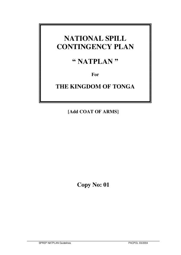 The Government of the Kingdom of Tonga has developed this National Spill Contingency Plan (NATPLAN) as part of its commitment to protecting our valuable natural resources and environment from the threat of pollution incidents. NATPLAN has been developed to reflect the essential steps necessary to initiate, conduct and terminate an emergency spill response on, or into the navigable waters of the Kingdom of Tonga, on the adjoining shorelines, the waters of the contiguous zone or into waters of the exclusive economic zone.