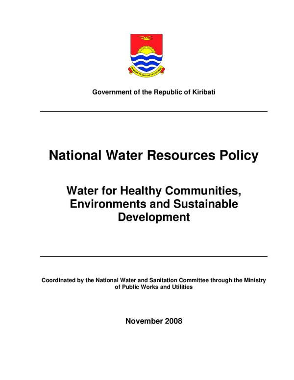 The NWRP provides a framework for leadership and coordinated action in the supply of safe, adequate and financially, technically and environmentally sustainable water services to rural, outer island and urban communities in Kiribati and for the protection, conservation, sustainable use and efficient management of Kiribati's water resources. It is directed at improving the welfare and livelihood of I-Kiribati and represents the vision of the Government of Kiribati (GoK) for the water sector.