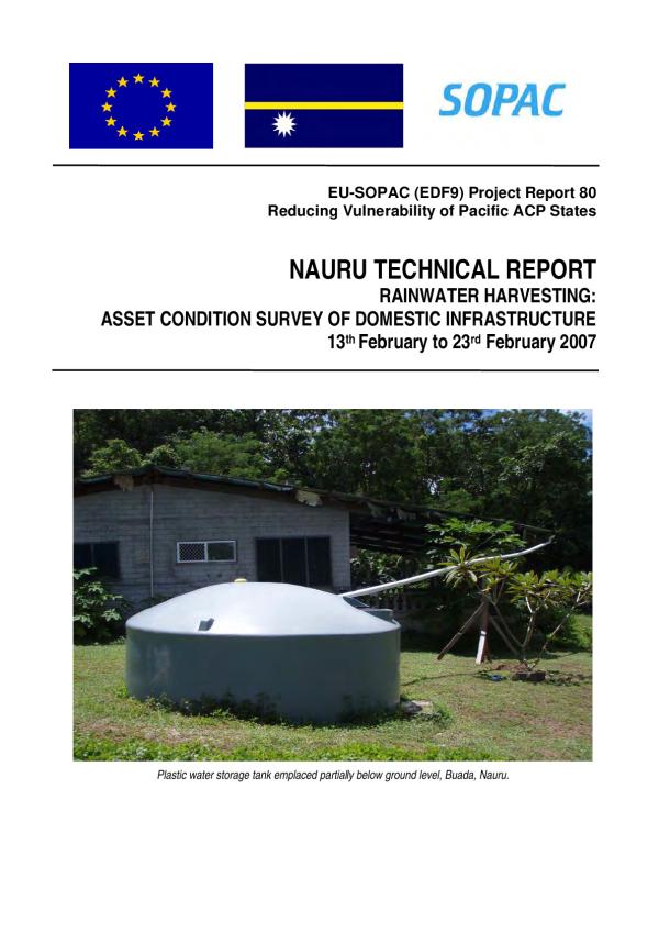 The mission was undertaken as an integral part of the Key Result Area 2 (Water) contribution to the SOPAC EU EDF8/9 Project "Reducing Vulnerability of Pacific ACP States" with the objective of field surveying the current asset condition status of domestic and community rainwater harvesting infrastructure. Although a little over eight field survey days were achieved on-island, daily progress was compromised by various difficulties, particularly the limited availability of diesel fuel on-island which impacted both ease of transportation and availability of electricity and water. Despite these constraints, two field survey teams visited a total of 308 properties within the districts of Buada, Yaren, Meneng, Anibare and ljuw, initiating a comprehensive database which can either be fully completed within the remaining island districts at a future date, or used with some confidence as a statistically representative sample for forward interpolation of "whole-of- island" conditions.