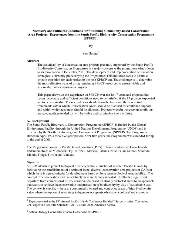 The sustainability of conservation area projects presently supported by the South Pacific Biodiversity Conservation Programme is a major concern as the programme winds down to its termination in December 2001. The development and implementation of transition strategies is currently preoccupying the Programme. This initiative seeks to ensure a smooth transition for each project to the post-SPBCP era. The challenge is to determine the most effective ways of using remaining SPBCP resources to ensure viable and sustainable conservation area projects.