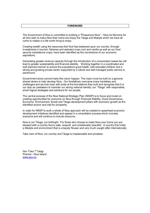 The objective is to build a sustainable future that meets our economic and social needs while preserving environmental integrity, social stability, and the Niue culture. Niues journey towards prosperity commenced in 2003, under the National Integrated Strategic Plan 2003 - 2008. The achievements for this period were mixed. A category 5 cyclone that caused widespread damage 6 months after the Plan started, diverted financial and other resources to recovery and rebuilding post-cyclone. The strategic objectives have been adapted and strengthened for the 2009-2013 period.